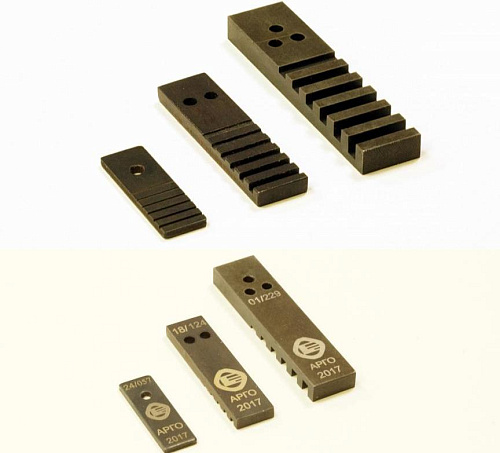 Изделие несет полную информацию об изготовителе (товарный знак предприятия наносится на обратную сторону), серийном номере и дате производства. Согласно ГОСТ 7512-82 (2017) определяется маркировка эталонов. Отверстиями определяются типоразмер и материал изготовления.